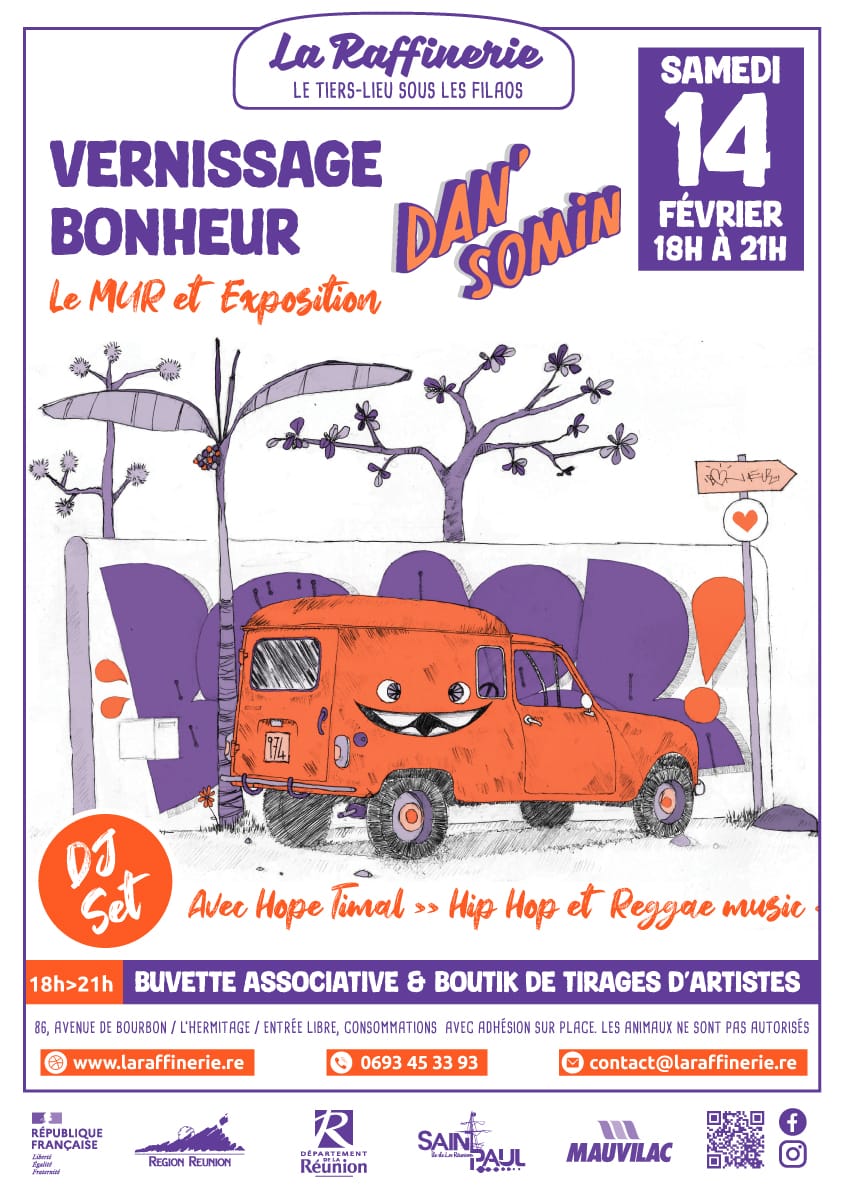 Nous avons le plaisir de vous inviter au vernissage de l'exposition "Dan Somin" par l'artiste Bonheur. Vous pourrez également découvrir le MUR, le nouveau mur performatif de La Raffinerie.